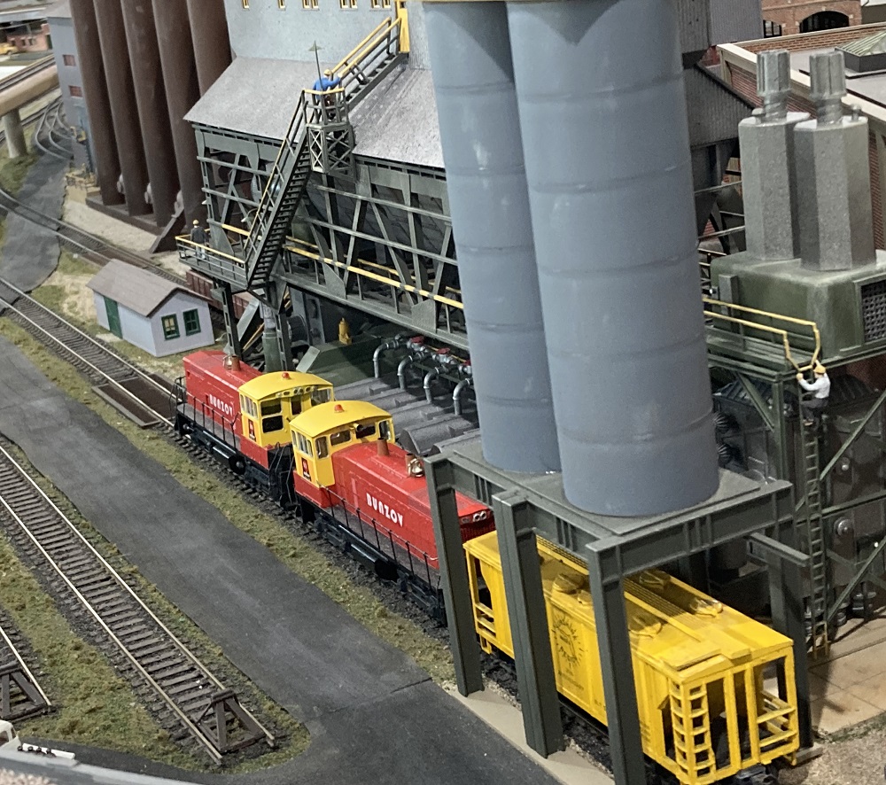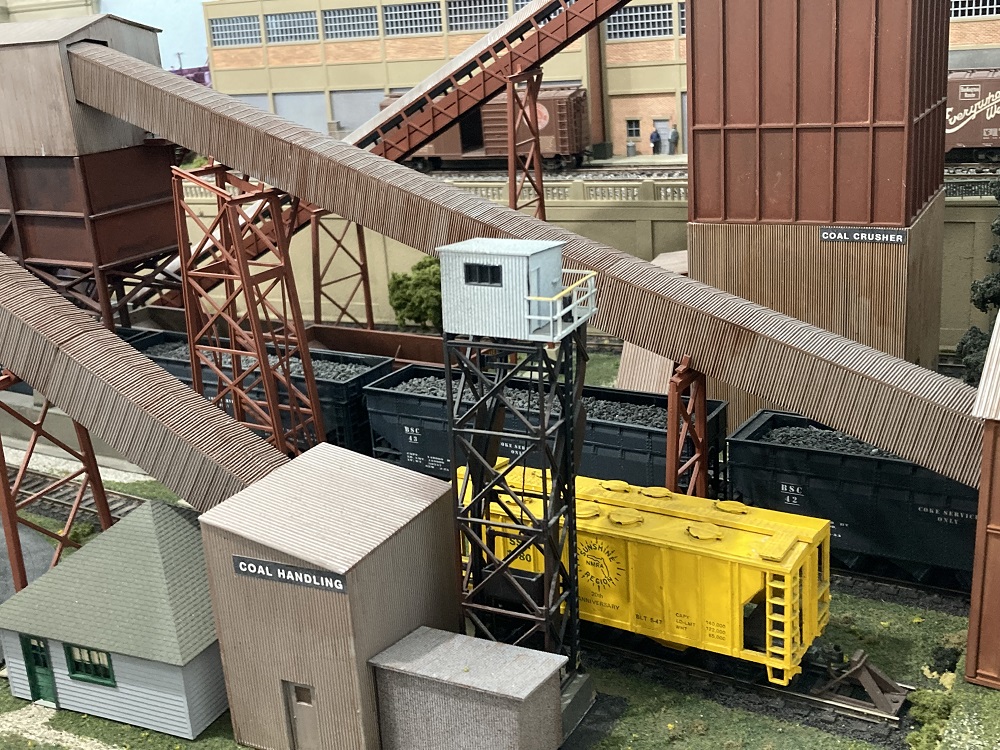 The A&S wraps around the room (and into various bathrooms and closets) with a lot of industrial switching on the wall-side, and a huge steel mill (painful to look at, what with all the detail) down a central peninsula. The interesting thing is that the mill is serviced by a car float (mounted on a swing-out, swing-down bridge with a ferry on it). It was done very slick and we never had any problems with it (and yes, you need to counterweight load it).