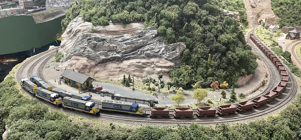 An empty westbound ore run meets a light engine movement at Harris Glen. Trains had been parading through this burg two and three at a time! (Photo: John DV)