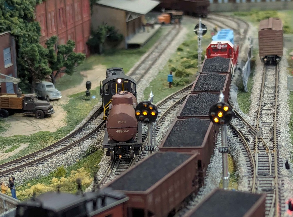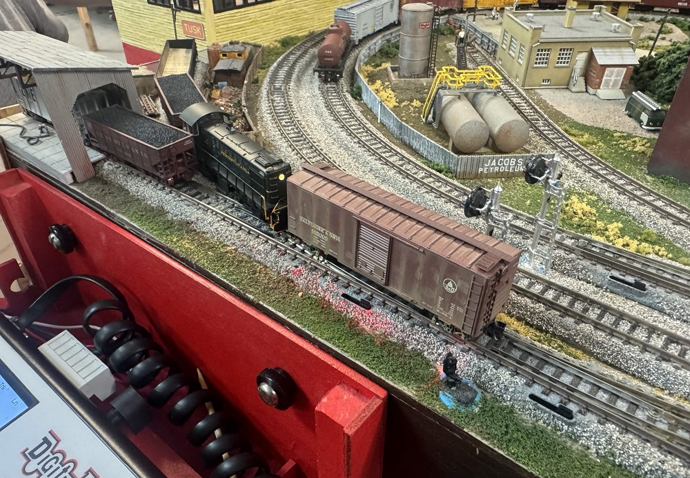 Of course, Zeus couldn’t be found the day before an I had no confirmation of what he’d bring for his ACL version of my railroad so I printed up Pennsy switchlists and set up with that in mind. We started with me as dispatcher, Mike as Tusk station operator, Kyle on levers, Zach (a late stand-in) on the scheduled runs, and Jim training young Luke on the coal extras. Oh, and Pete to provide general distractions.