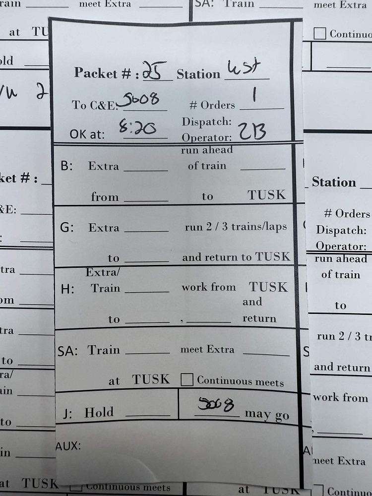 The thing was, today was a big change to the layout. Not only were the timetables altered (now version 6) but we were also going to run my packet system, altered to work on this railroad. At first, I wasn’t sure – there was a lot of dicking around (I mentioned Pete, right?) and I could hardly be heard by the Station Operator, five feet away. But things finally settled down, people got into the session, and the SO and I got into the swing of the packets. And yes, I believe they worked better than the card system (with its hand-back bit that always distracted from the railroad). Now you can grab up a hooped order, check it and proceed. Yeah, we had piles of the thing at the end – we wrote something like twenty-six or so of them but it really added a bit more railroading to this diminutive giant.