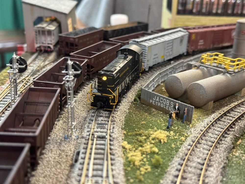 A coal train rumbles past a local. Kyle mentioned it looked short. Well, by now it’s dropped two hoppers off. But I also found one in the bottom of the storage box. Woops. Shorted the customers again. (Kyle S)