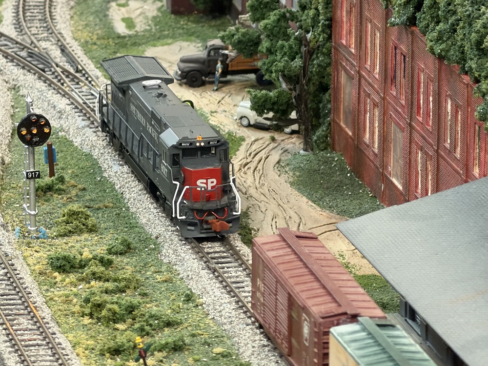 Of course, I always invite guests to run their engines if they wish – he had a big SP six-axle unit that just fit around my curve (that old train order signal on the closed depot is really at risk when we do this). But Pete had another bloody nose unit, four axle and with sound, too, so Zach took that one out.