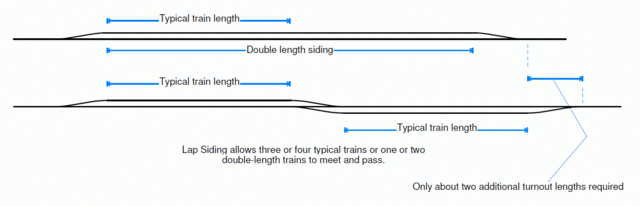 We ran a brisk session and I think the Protorail guys were happy with the pace overall. Our Crowning Moment of Awesome came at the three-quarters moment at a lap siding meet. Below you can see how a lap siding works. It allows you to have all sorts of flexibility and actually save space. On the VSW, this area is controlled by a CTC Interlocking controlling all turnouts on shared trackage, owned by L&N but worked by Southern. As it turned out, Zeus and I found ourselves with two long trains coming towards each other. We handled it in the classic method – one threads down the upper side, the other on the lower side, giving them just enough room to pass.