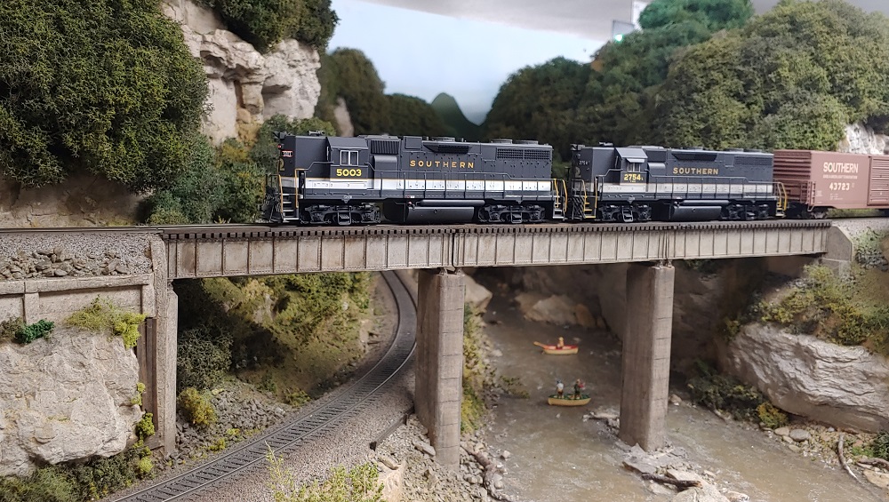 A Southern hot shot, loaded with auto parts, storms across the Guest RIver. Below the bridge, the busier L&N mainline waits for yet another train.