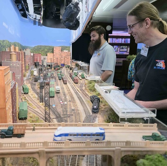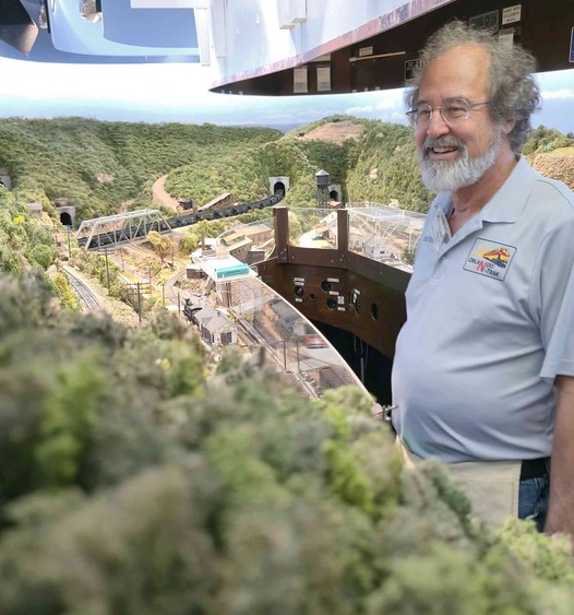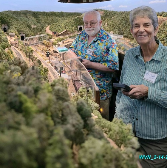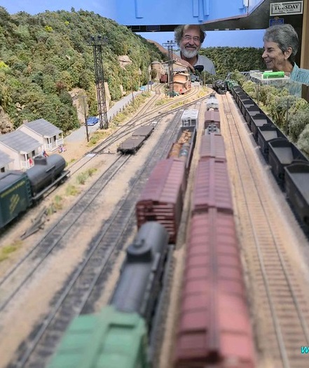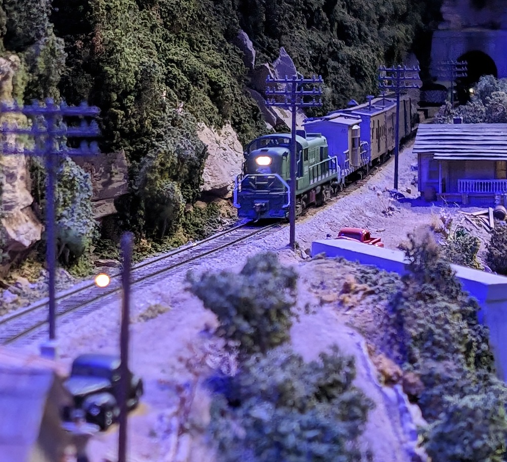 So, yes, finally I was away from the pandemonium in Harris, going through the upper tunnel and feeling like Kelly’s Heroes’ Oddball after he destroyed the railroad work camp with his sherman. I had the long hair, the goofy expression, and I was clear of it. Rolled down the hill through the gentle loops towards Elkview.Nobody was in my aisle. I was alone. I could sit at Elkview and wait for the helper to return and take my cuts off. Just as I cleared the aisle-end tunnel and was crossing the trestle into the third, Greg came around the corner for a photo and noticed that I was missing (at least) a caboose off the rear end. WTF? Again?