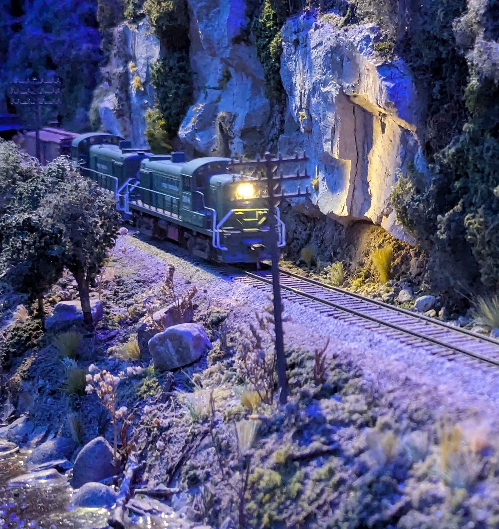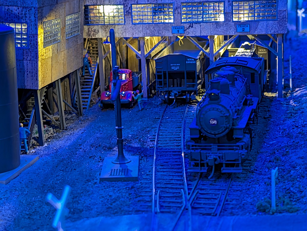 “Well, it it’s in the tunnel, I’ll find it,” replied the helper. That pissed me a bit – what if it was derailed? What if you made it worse? When he did emerge (without any missing rolling stock) I told him (firmly) to hold until I figured out what the fuck was going on (railroad term). Greg was already under the layout looking and I hated that he was working on something that was my responsibility. I joined him under and crawled through the below-decks bilge. Finally, inside the tunnel I’d just departed, way in the corner, I found the caboose and the two hoppers that had given me problems (railroad and social) back at Harris. With that, I gently pushed them out of the bore, Greg hooked them up and I proceeded (a wiser and dustier man) down to Elkview, the helper dutifully following me.
