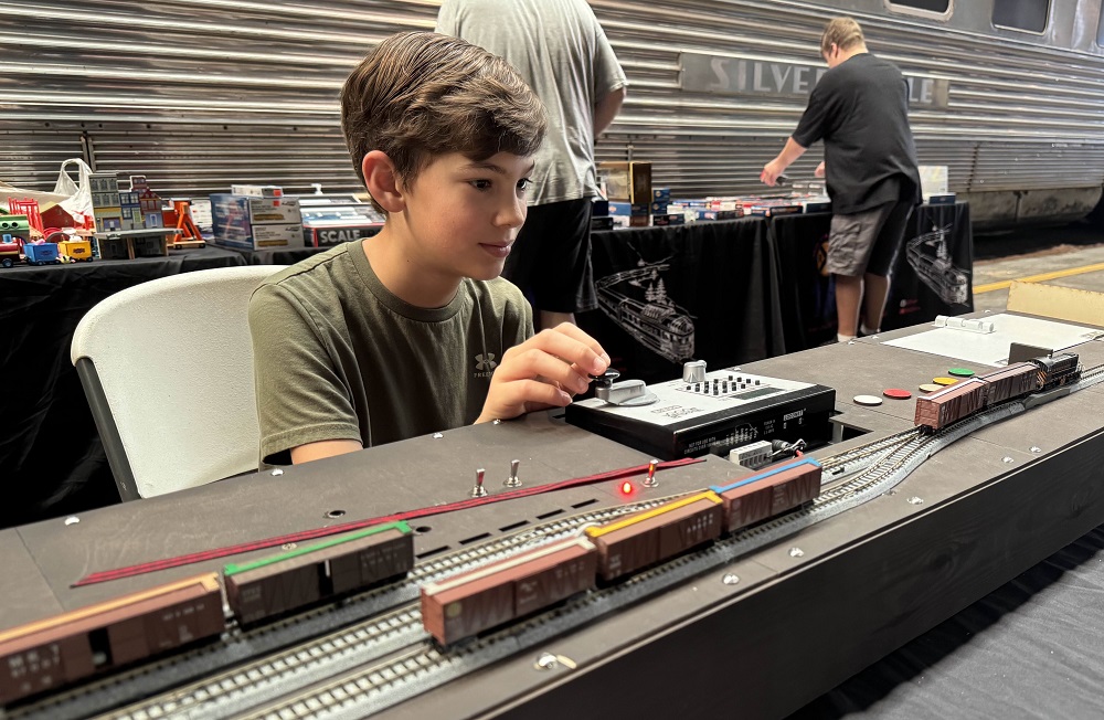 The railroad museum here is impressive – there was once an airship hanger here. Now it’s an open train shed with all manner of equipment here, including a couple of trains that roll out every-so-often to get visitors short rides around the grounds. I was helping to man a table with Zeus and Jordan, two nice guys (of course, I’ll note if you added their ages together, I’m still older). I set up our West Fork switching puzzle so that the crowd could give it a go.